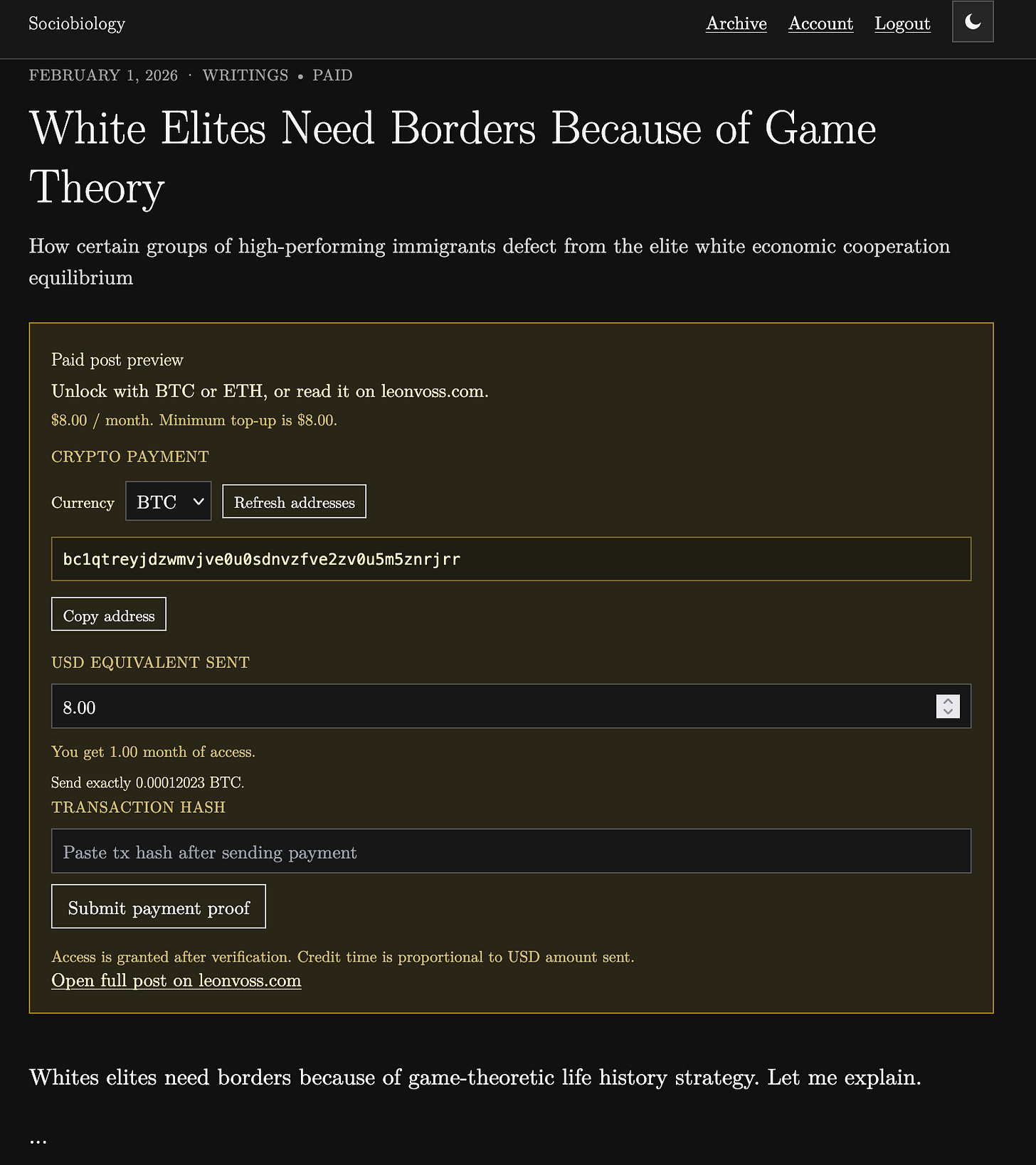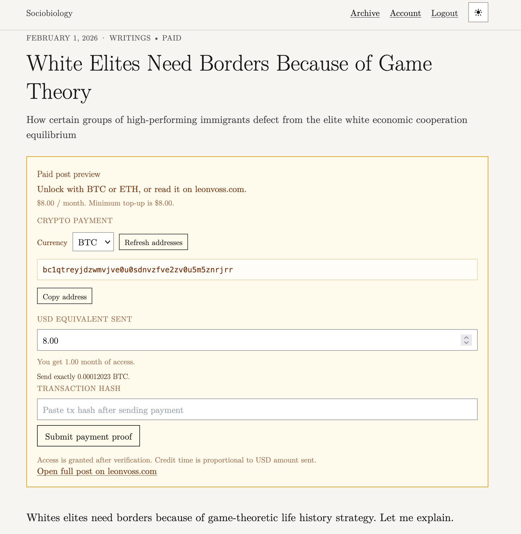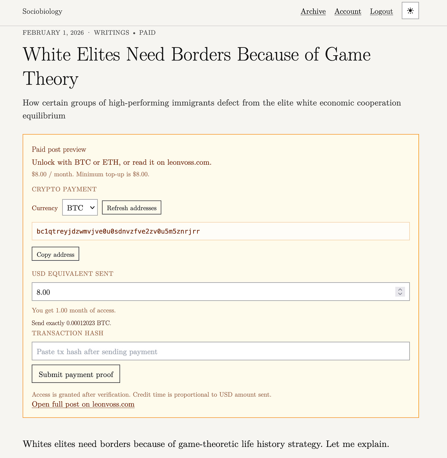 Want to subscribe to me with crypto? You’ll get 33% off the Substack price at sociobiology.org