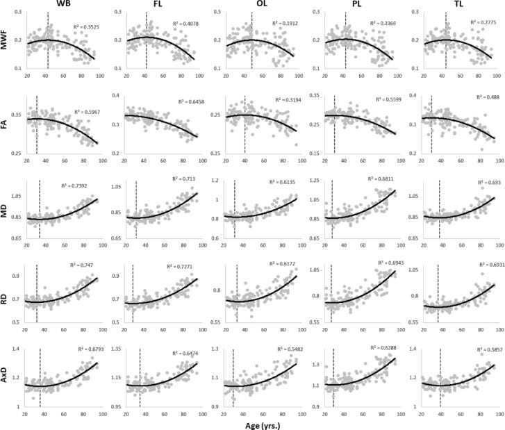 Here’s another with multiple myelin measures and scatterplots so you can see how development after the age of 20 really relates to aging after the age of 60 in magnitude: