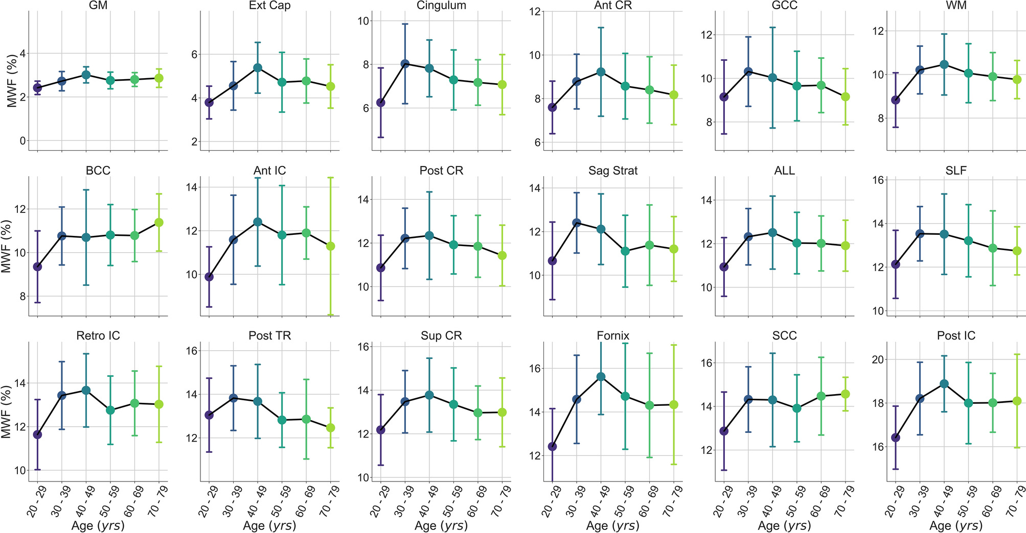 The actual data shows that myelination continues into the 40s for most parts of the brain. Below, GCC, Ant CR, and Ant IC are in the frontal lobe area: