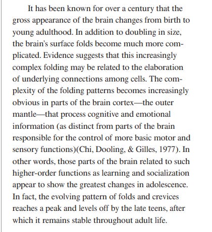 Back to Sapolsky, he goes on to discuss gray matter. He repeats the misconceptions I debunk in my book, namely that pruning somehow hits a critical point during the teens or 20s. Rather, pruning continues into old age.