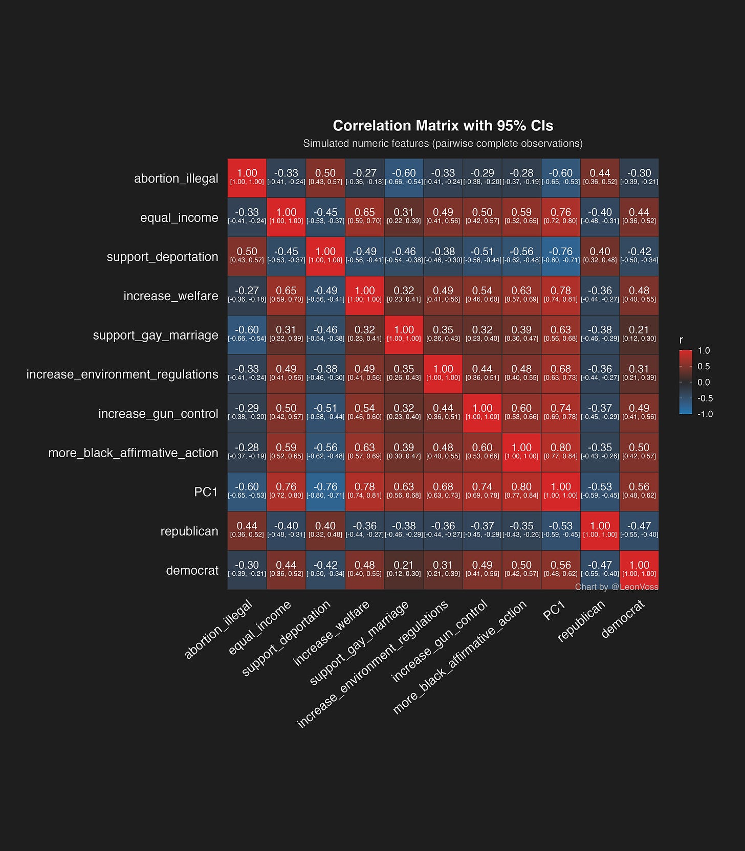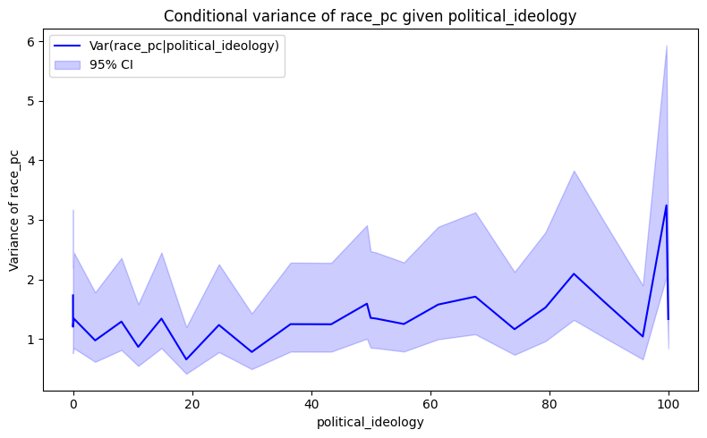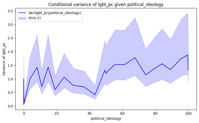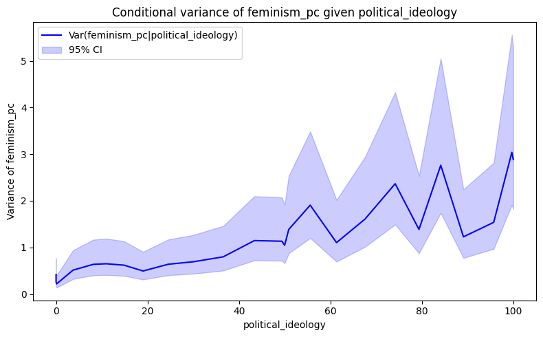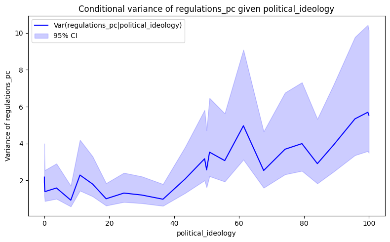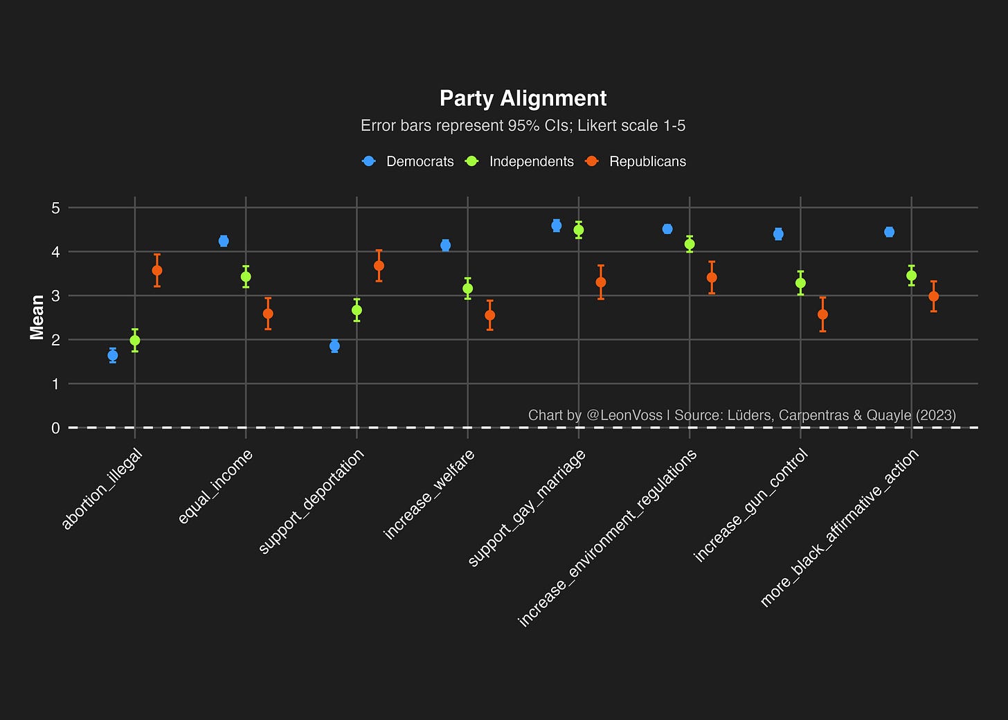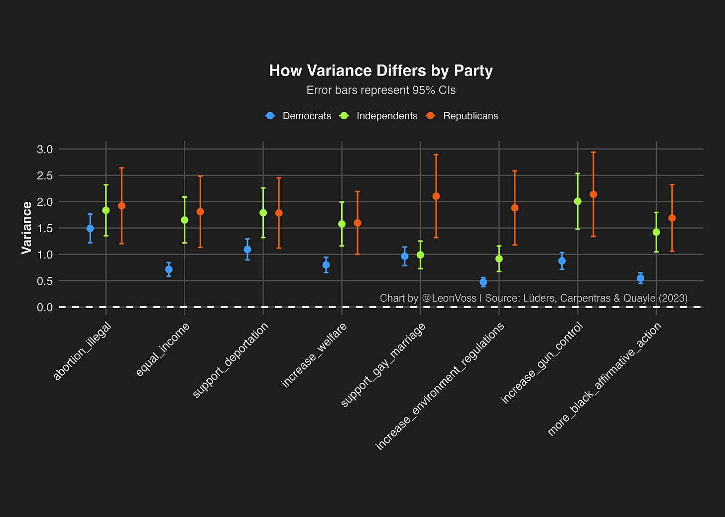 This paper (pic related above) is floating around X. It claims that liberals have less diversity in their views than conservatives. At first I was skeptical because the analysis is not standard. The authors are sociology types using some kind of wonky network analysis instead of normal statistics. Luckily, the data is open source, so I downloaded it and computed the 95% confidence intervals for the variances of the items by party.