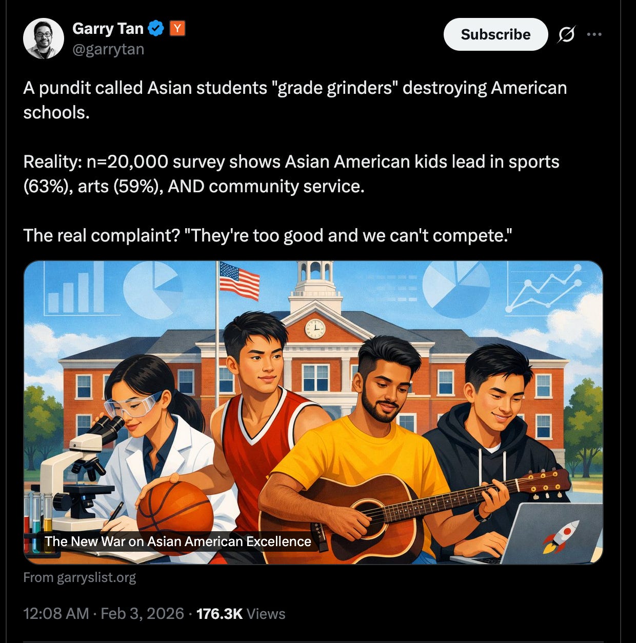 Garry Tan obtusely misses the point that striving is selfish, defective, and that if you set whites and Asians at equal levels of strive, whites will outperform. It’s just that whites strive less because they have more cooperative genes. Whites don’t believe Asians are too good, we believe they are cheaters and meta-cheaters and they exploit our system too much. If we believed they are too good, we would move to Asia. Rather, it’s Asians who move to white countries, thus proving by revealed preference that Asians know that whites are better than them, and they narcissistically lie about it to get ahead.