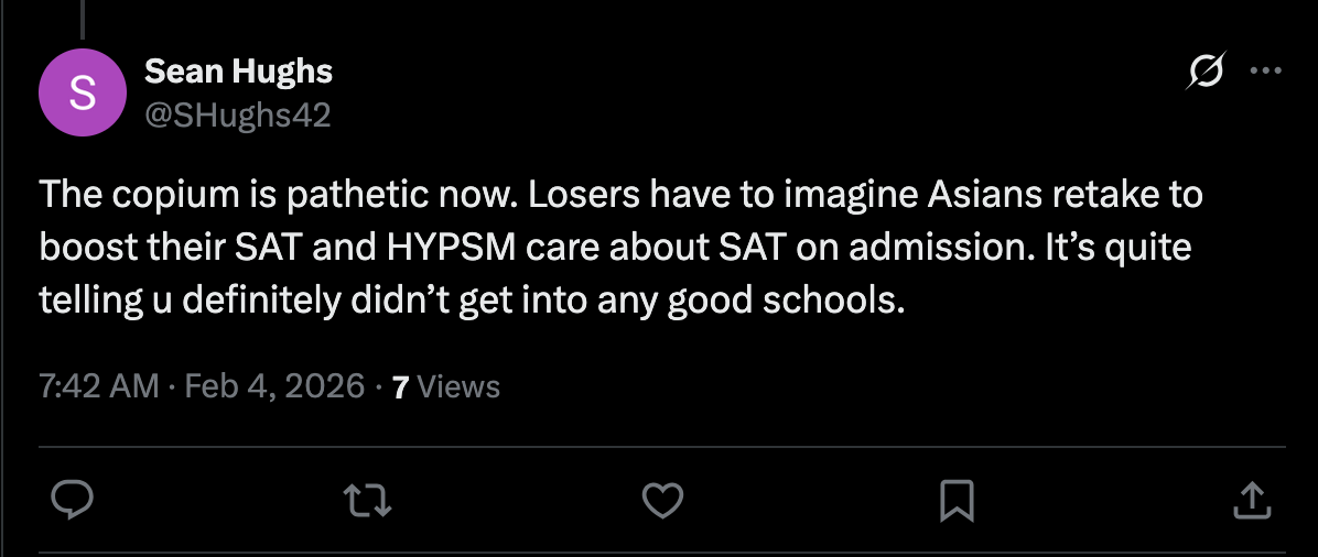 I went to a university that was about half Asian. I'm sure that my White male equivalent, even with my 99th percentile scores, would not have gotten in. But with the way things are now, it looks like that would've been for the better for him.