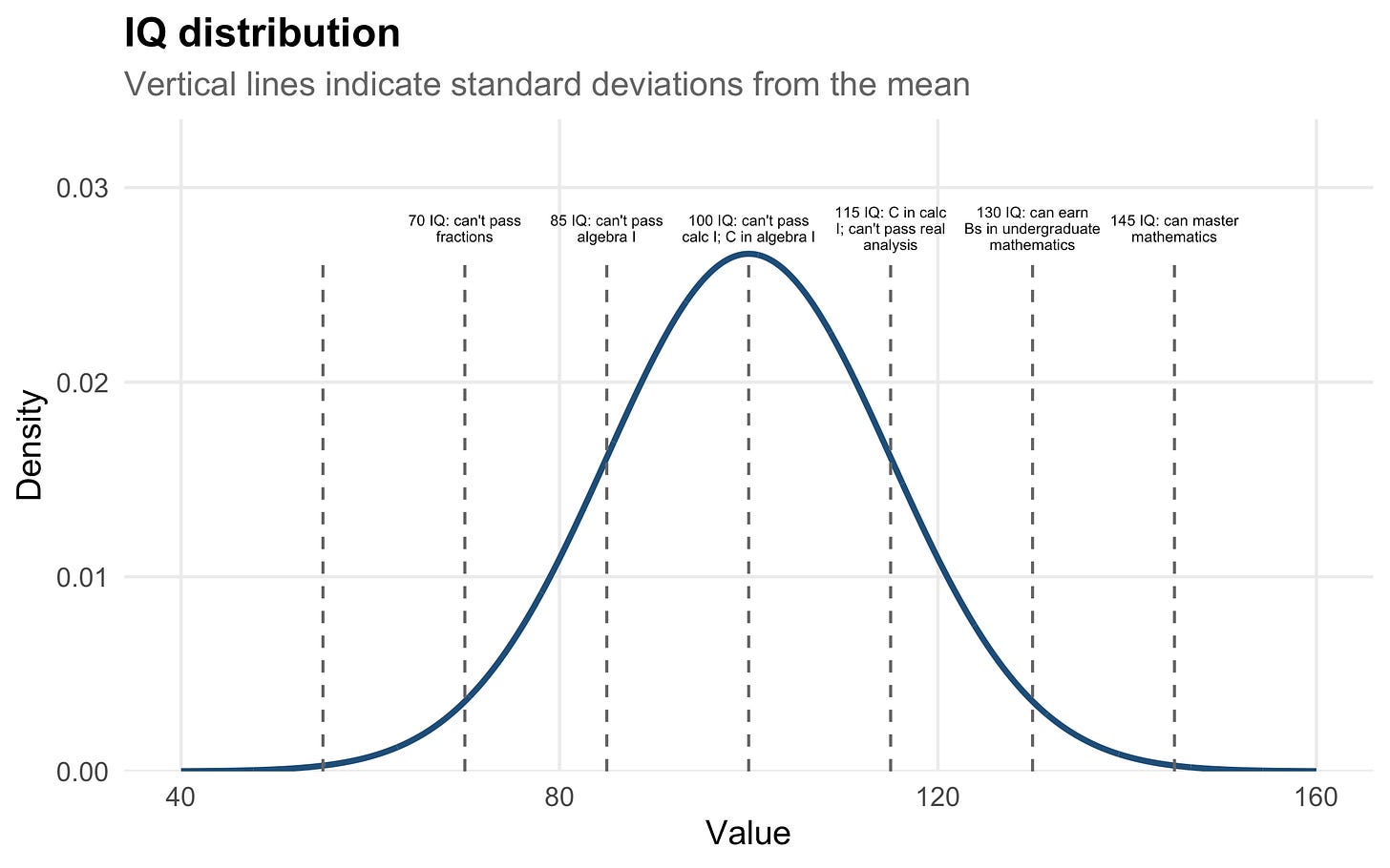 For calculus, 35% of people who attempt it in high school in the US fail. But only about 20% attempt to take it in high school. So a decent estimate is that 13% can pass calc 1 in high school, which is close to what I put above (15% of people are above 115 IQ). It seems about 25% of people with university diplomas have passed a calculus class, and about 50% of people get a university diploma, so that’s 12.5% of people. In other words, Calculus filters >85% of people.